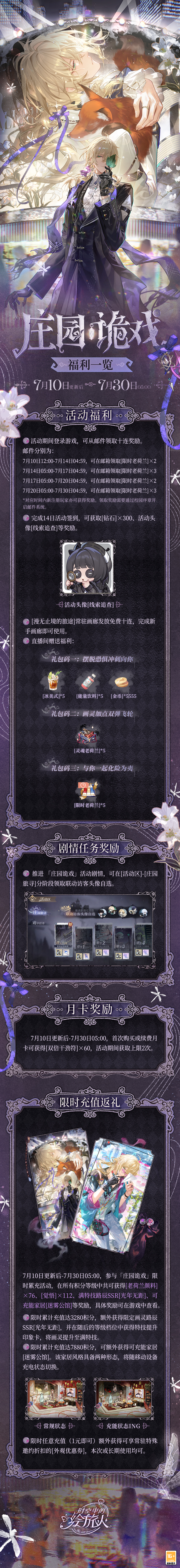 7月10日更新后-7月30日05:00,全新联动版本「庄园诡戏」活动开启,登录游戏,参与签到与玩法,可领邮件十连、常驻画廊免费十连、[钻石]*500、[灵魂老荷兰]、[活动头像]、[联动访客头像]等专属奖励。