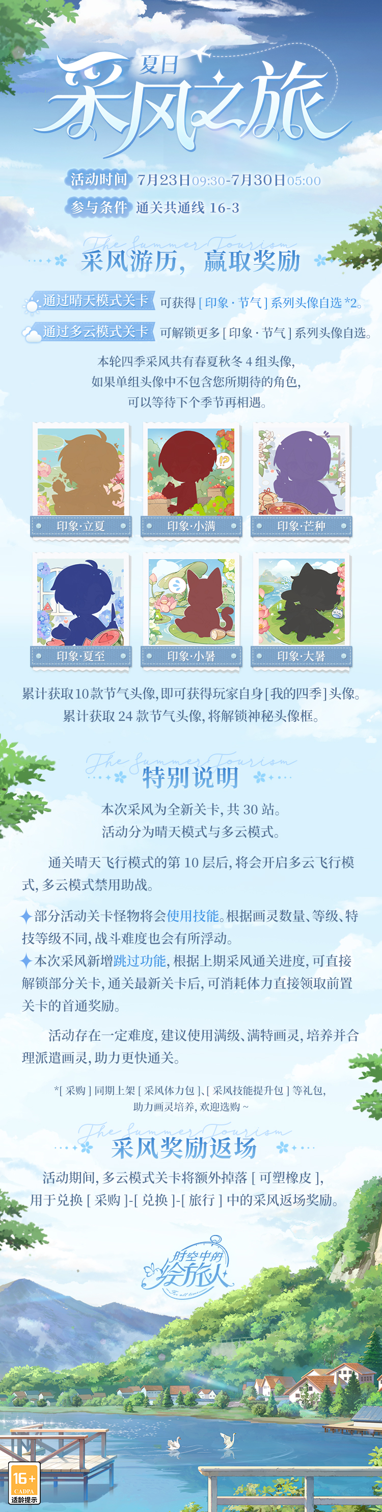 7月23日09:30-7月30日05:00,全新「夏日采风之旅」正式开启,参与活动可得[印象·节气]系列头像奖励。